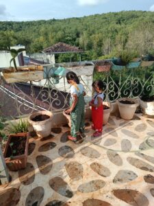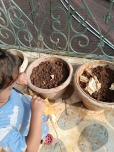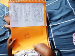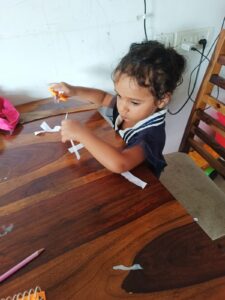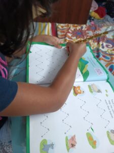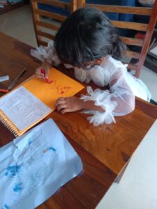 Since we had not practiced much writing over the past couple of months, Ahna lost her refined grip and control. So we did some basic tracing activities to get her started and then continued with her writing books. She also wrote a letter to nana and nani to welcome them to Goa for their visit.