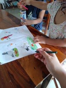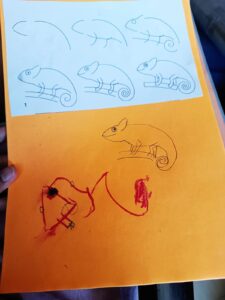 For art, we started some sort of structured drawing lessons following increasingly difficult steps to complete a picture of different animals. When I say “we”, I mean “we”. Side note, I wated to be an artist growing up but sense prevailed and I chose a different path. However, I believe somewhere in a confused isolated optimistic and often lonely corner of my heart, that I can get a do over with this. So here’s to homeschooling myself with art and cheering for second chances. Ahna grew in leaps and bounds over a few sessions and I was, least to say, amazed. She also had a few opportunities to pain without me around(which means she could make a mess and do whatever she liked with the tools given) under her dads supervision, and she actually came up with quite a few creative pieces of work. Another day homeschooling myself and learning something new. We did one picture for art study and she found it quite interesting. She loves doing art study through the books we have.