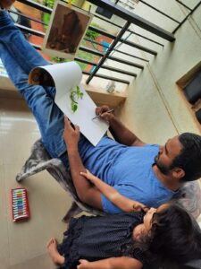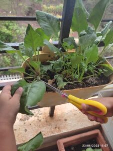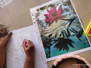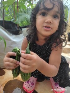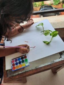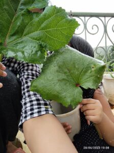 Weather- We read some books on weather and the changes it brings. We clubbed some of Shirley hughes poems with this and read about the beauty of spring. Of course this meant having to go out and splashing in puddles and getting wet in the rain as we did several nature walks. We saw how many new beautiful plants grow in the rains and thanks to my husband, we ate some edible flowers on our walk. We observed closely how earthworms kept collecting in containers up on the terrace, new baby earthworms each time we visited up, and we loved how big our Okra leaves have grown! So many opportunities to speak about the clouds, rainwater and its many benefits and how it fills up our natural reserves. We also saw a few of these ponds newly formed due to the recent rains over the past 2 weeks.