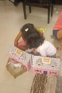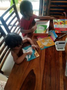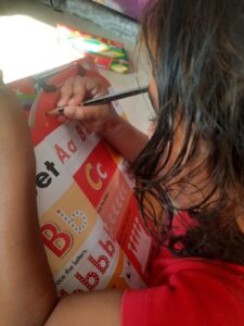 Ahna loves working with paints and crayons. She colours almost 2-3 pictures every day in her own time. It has been helpful to have her handle her crayon drawer and colouring books on her own. She is also growing in learning to be responsible for it. She has ‘set up’ colouring activities for Hope also and enjoys the bonding experience(even though Hope is not able to colour for long periods)