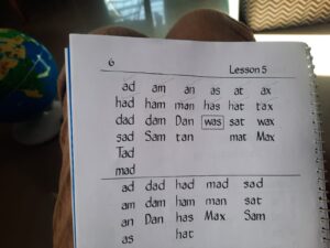 We are following the Alpha phonics primer for our reading lessons. We try to do one lesson a week. Sometimes this can be 5-6 words and other times it can be the whole lesson as designated in the book. Since the words in the book include lower case letters, I usually use magnetic substitutes or foam letters in capitals to do the same lessons with her. Simultaneously, I introduce what the lower case letter counterparts look like.