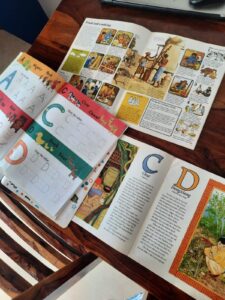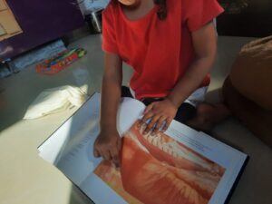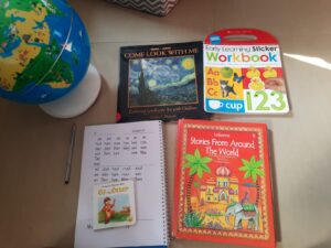 With our Art study, we have been doing the “Come look with me” series of landscape art. We look at 1 picture in 2 weeks and discuss it. She can understand different shades of colour and underlying emotions that the artist might want to portray. In one of the pictures we studied, she saw bones and no life and said that it was a place where nobody visited and in another one, she saw no children or people playing outside a house and thought it was not a very happy picture because there were no people in it.