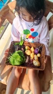 I add this again here because what we have been learning is so different to gardening, and yet, conceptually quite similar. Ahna has been learning personally and closely where her meats come from. Her dad has been taking her to the fish market once a week when they buy fish together. She can identify the fish out there and choose which ones they would want to bring home to eat that week. We also connected our food source to a local farmer with chickens and we chose one chicken to butcher and bring home. She named the chicken “Gogogaga” like almost everything else in her life right now (her imaginary husband, sometimes the imaginary baby in her womb, sometimes her friend who she plays with)