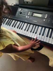 Since music(keyboard) and gymnastics have been the new additions to home education this new year, there is so much excitement around it. With her keyboard skills, she is learning to differentiate between the high and low notes, is learning to name the notes and find the keys. She learned the ABC notes in order and labelled all the ABC notes on the keyboard. She then explored how each set of ABC sounds different in increasing pitch as it progresses down the keyboard.