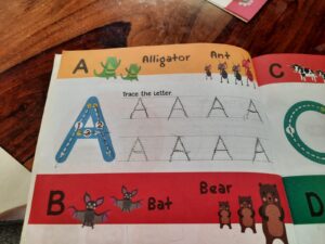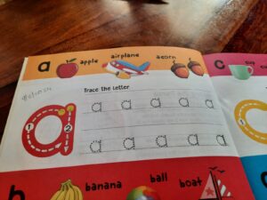 Since Ahnas fine motor skills have improved drastically over the past few months, we have taken up tracing and writing of 1 letter a week. I encourage her to put in ‘best effort’ as recommended by CM. We don’t focus on doing too many a day. This lesson takes about 2 minutes that one day of the week. She has not learned the lowercase letters through play so we are currently doing it together through these tracing tasks and through her reading lessons.